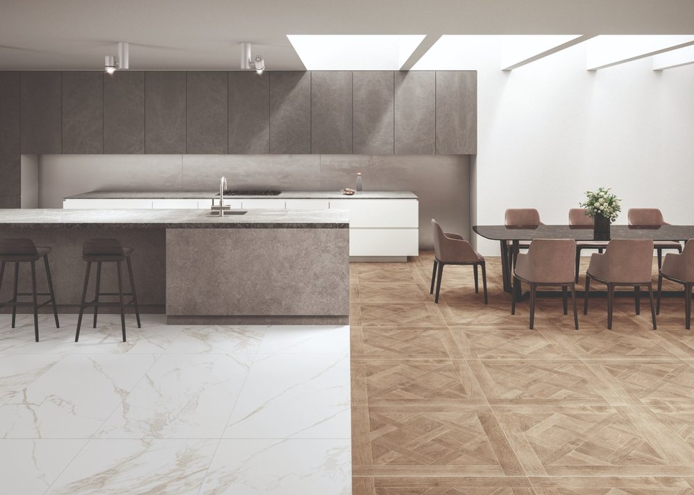 Porcelain tiles in 900 x 900 or 450 x 450 with matching plank 1510 x 240mm