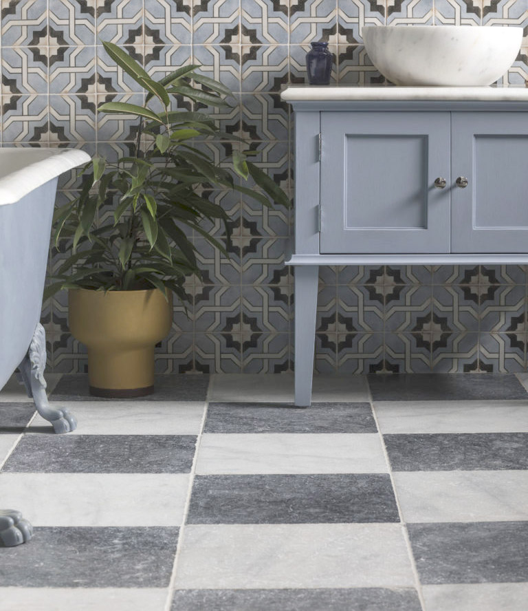 Classical chequerboard flooring in White marble and Grey marble tumbled edge, resembling the Italian combination of Carrara and Bardiglio marble seen in churches and Palazzos across the Italian peninsula.