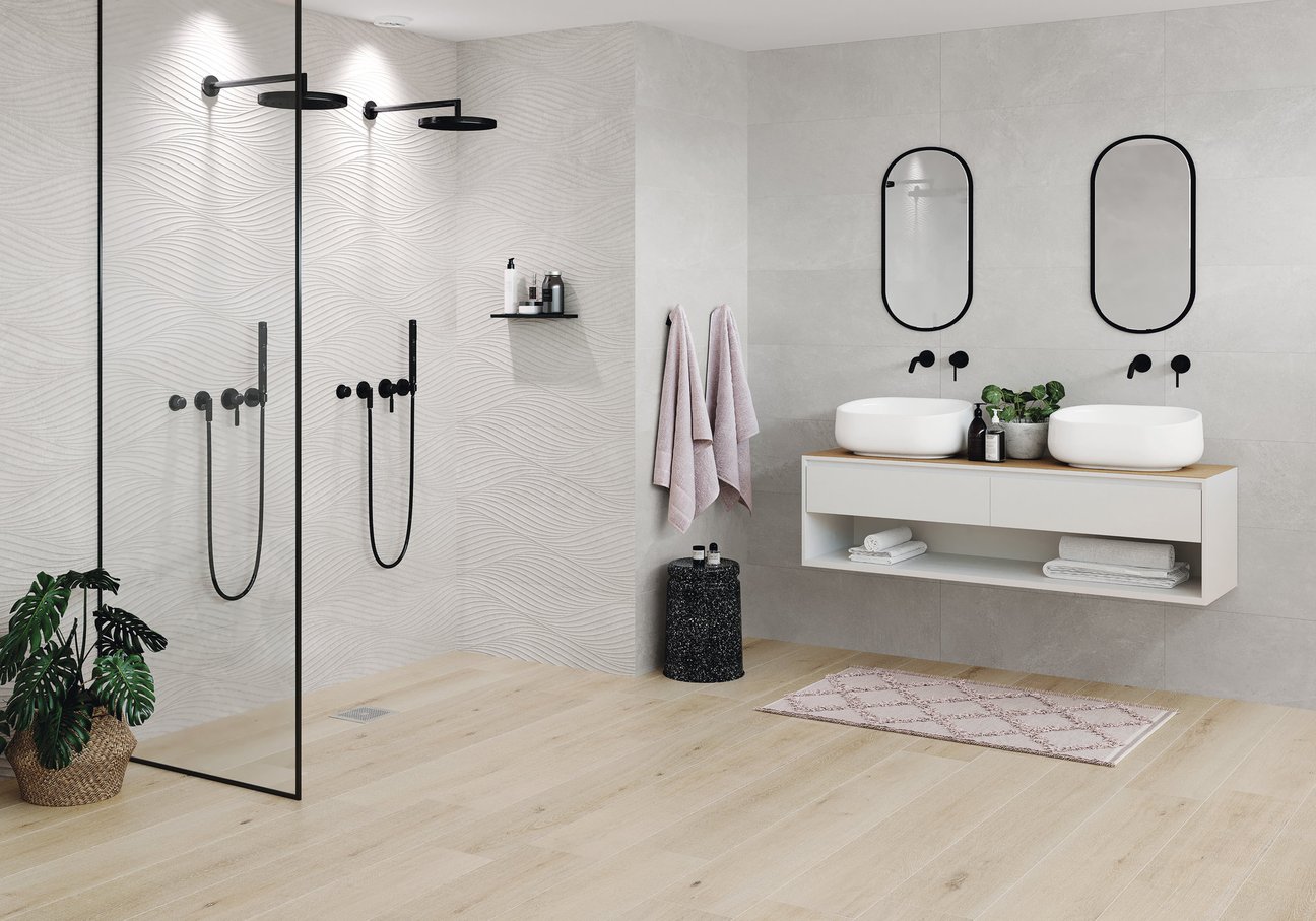 Porcelain tiles in 900 x 900 or 450 x 450 with plank 1510 x 240mm
