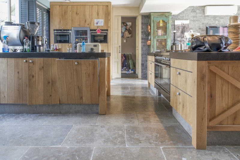 Medium to light grey with tumbled aged finish, it is very hard and perfect for a busy kitchen, hallway, conservatory floor.